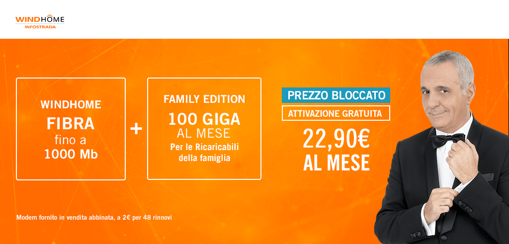Wind Home torna alla carica! L’offerta di Wind di rete fissa per i clienti privati offre: internet illimitato in ADSL o Fibra e una SIM Dati con 100 GIGA al mese da condividere con i numeri della famiglia a 22,90€ al mese per sempre, con attivazione gratuita in esclusiva online.