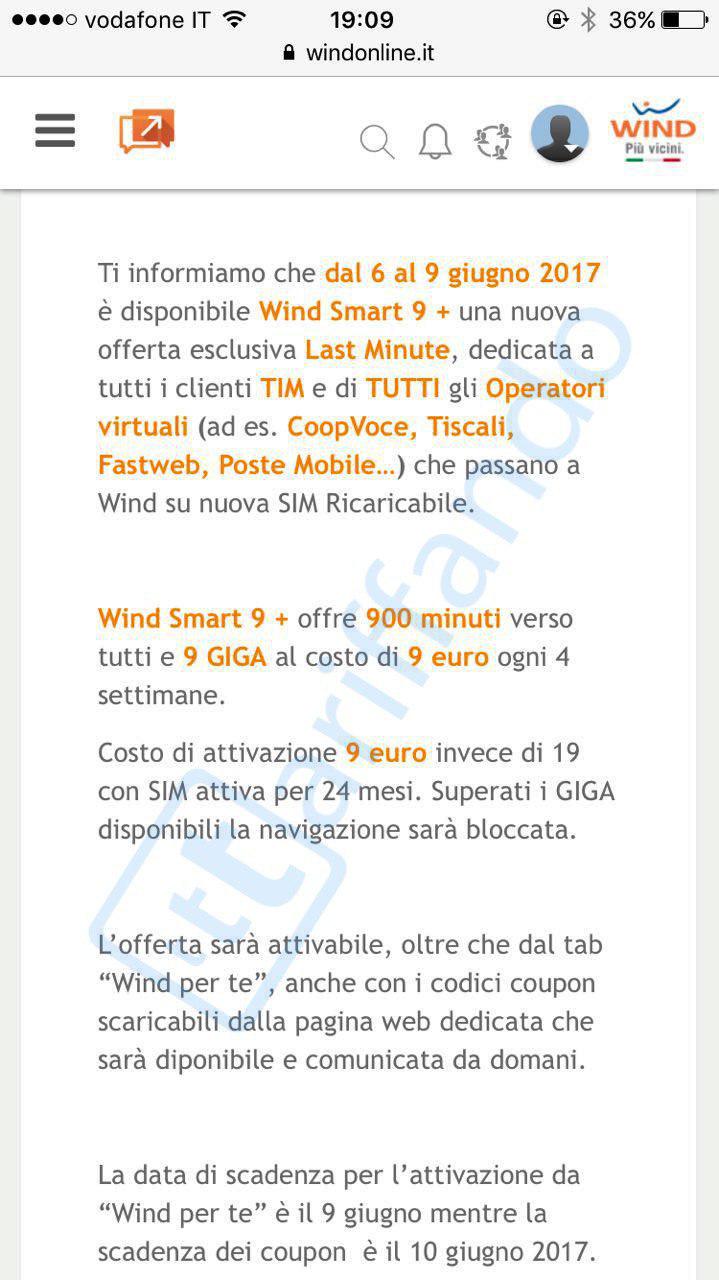 Vogliamo sottolineare, che la promo ha anche un costo di attivazione di 19 euro, che saranno soltanto 9 nel caso in cui la SIM resti attiva per un minimo di 24 mesi. La promozione è attivabile attraverso la sezione Wind per Te (entro il 9 giugno) e tramite coupon scaricabili attraverso il web (entro il 10 giugno), non ancora messi a disposizione.