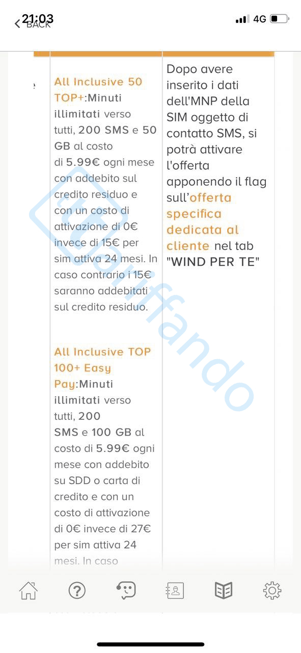 - All Inclusive 50 TOP+ prevede minuti illimitati verso tutti, 200 SMS e 50 GB al costo di 5,99€ al mese con addebito residuo e costo di attivazione gratuito invece di 15€ con SIM attiva per 24 mesi. In caso di passaggio ad altro operatore o disattivazione della SIM i 15€ saranno addebitati sul credito residuo.